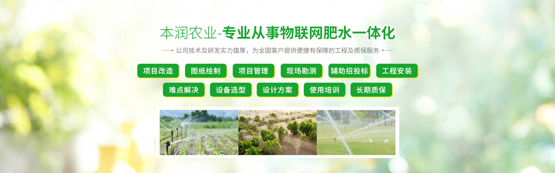 公司作為中國西南節(jié)水領域中的先導企業,設備先進,技術力量雄厚,擁有一套可開放對接的農業物聯網采集、控制、管理平臺。同時公司擁有屬于自己的科研開發(fā)團隊,每年都有適合市場需求的新產品適時推出更新,我司專業的灌溉設計團隊都擁有多年的施工經驗可出標準CAD圖紙及設計方案說明,能為客戶提供施工前后對比照,施工日志等資料,輔助政府需要的資料整理等。總之本潤灌溉本著用心的原則,完全可以作為您節(jié)水灌溉工程材料采購、項目施工、項目設計的灌溉服務式一站式平臺。